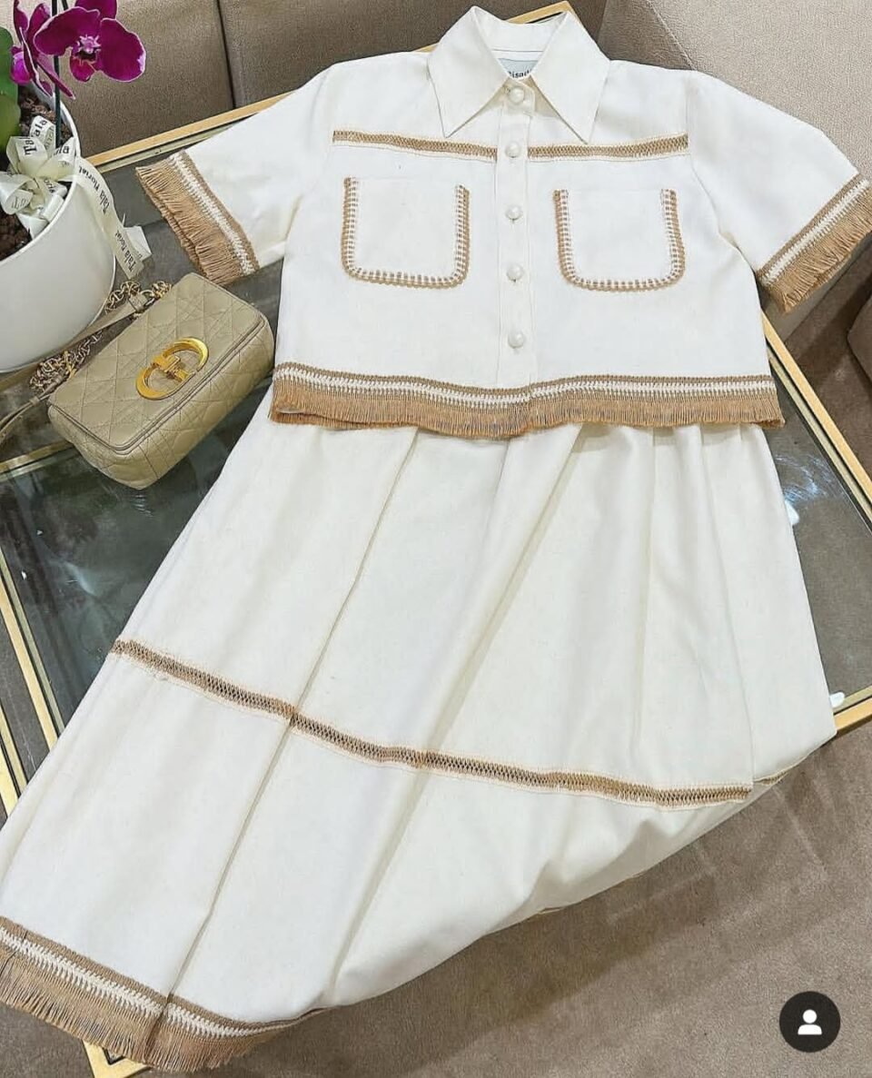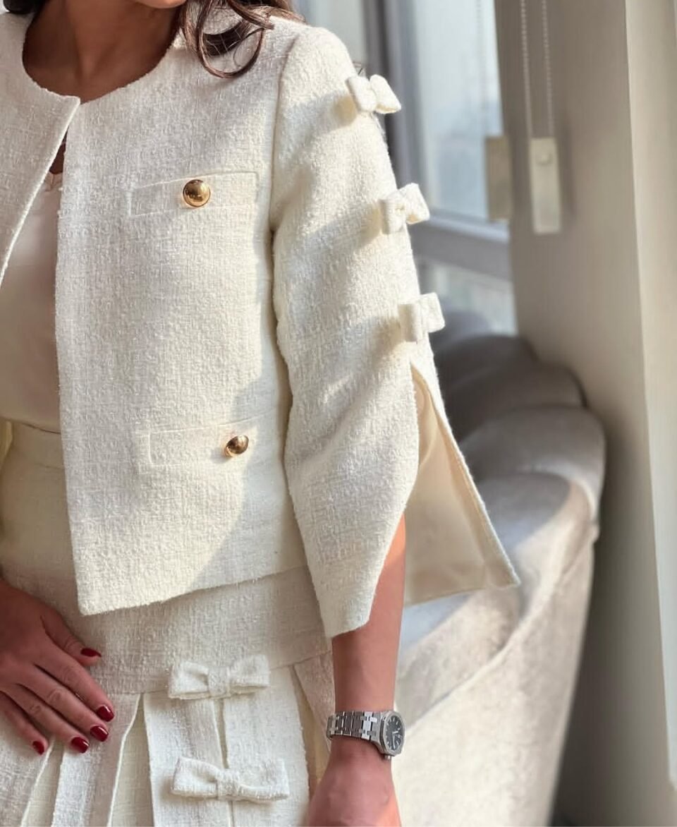 Textured cream blazer with pearl butterfly embroidery—delicate, detailed, and ultra-chic.