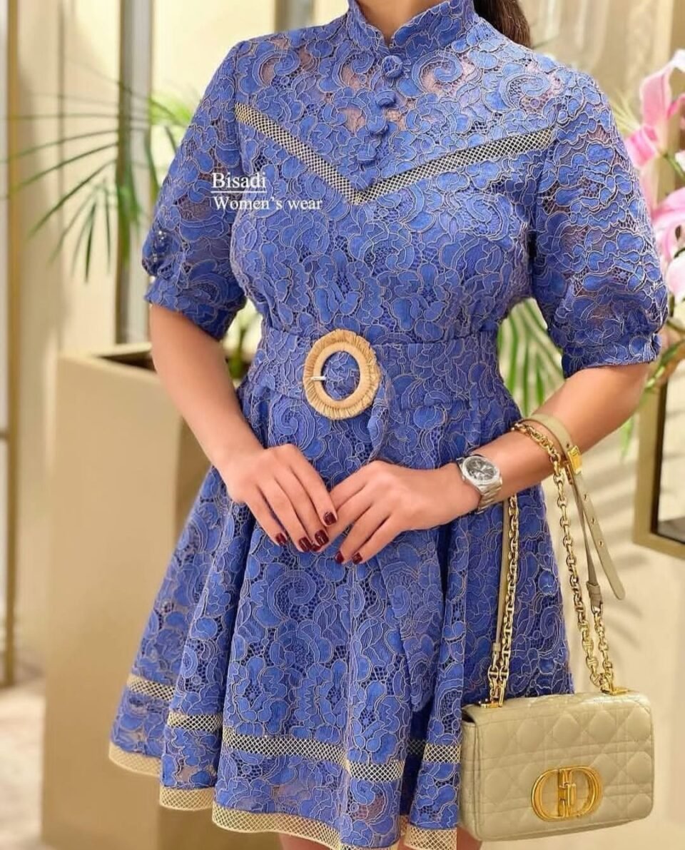 Make a statement in this red Yalda Collection dress, featuring lace accents, shimmer fabric, and a bold belted waist—elegant and festive.