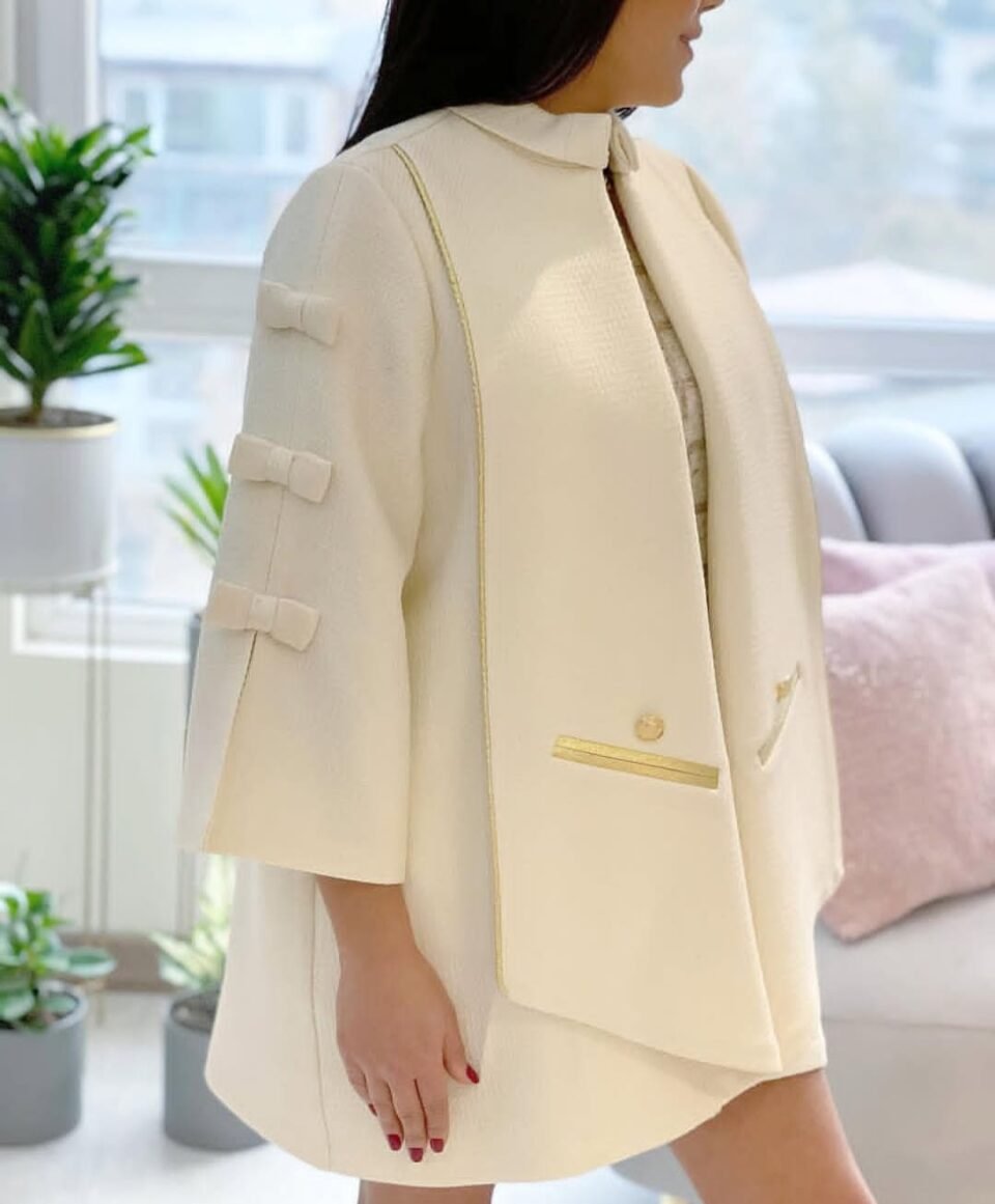 A soft cream mini coat with gold piping and delicate bow details along the sleeve.