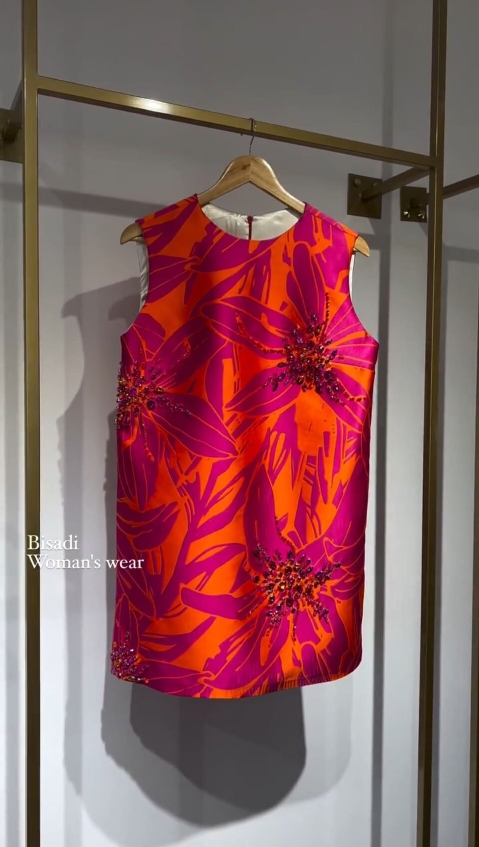 A bold, sleeveless shift dress in radiant orange and fuchsia with jeweled floral appliqués.