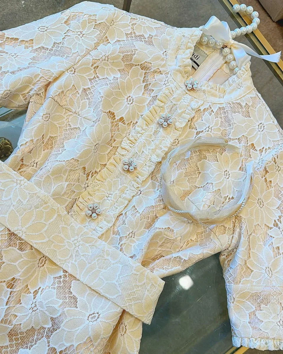A detailed ivory dress featuring lace cutouts, scalloped trim, and a pearl-accented waist tie.